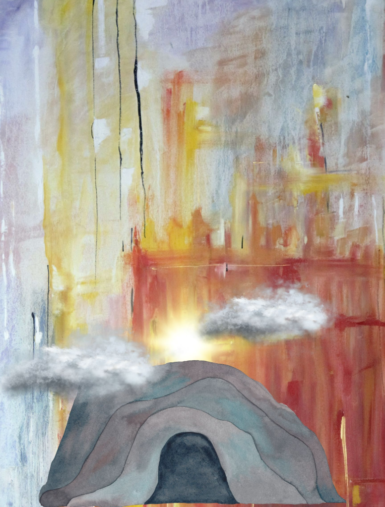 Abstracted sun streaked background, sunrising behind the tomb, with a couple of clouds in front of it. Made with Canva. Feel free to use with Credit to Pastor Katy Stenta