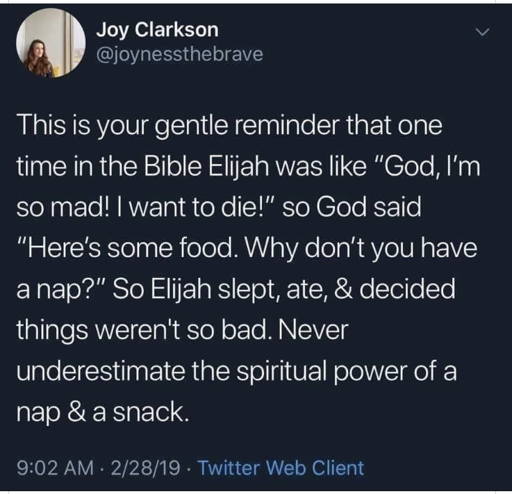 @joynessthebrave This is your gentle reminder that one time in the Bible Elijah was like “god, I’m so mad! I want to die! so God said “Here’s some food. Why don’t you have a nap?” So Elijah slept, ate, & decided things weren’t so bad. Never understimate the spiritual power of a nap & a snack. (This is one of my all time favorites)