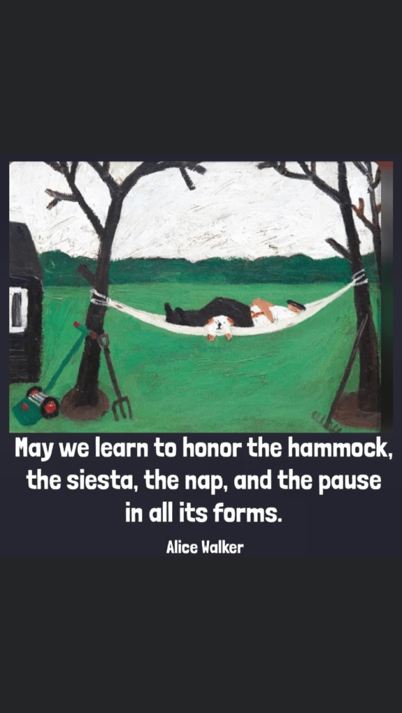 “May we learn to honor the hammock, the siesta, the nap, and the pause in all its forms.” Alice Walker