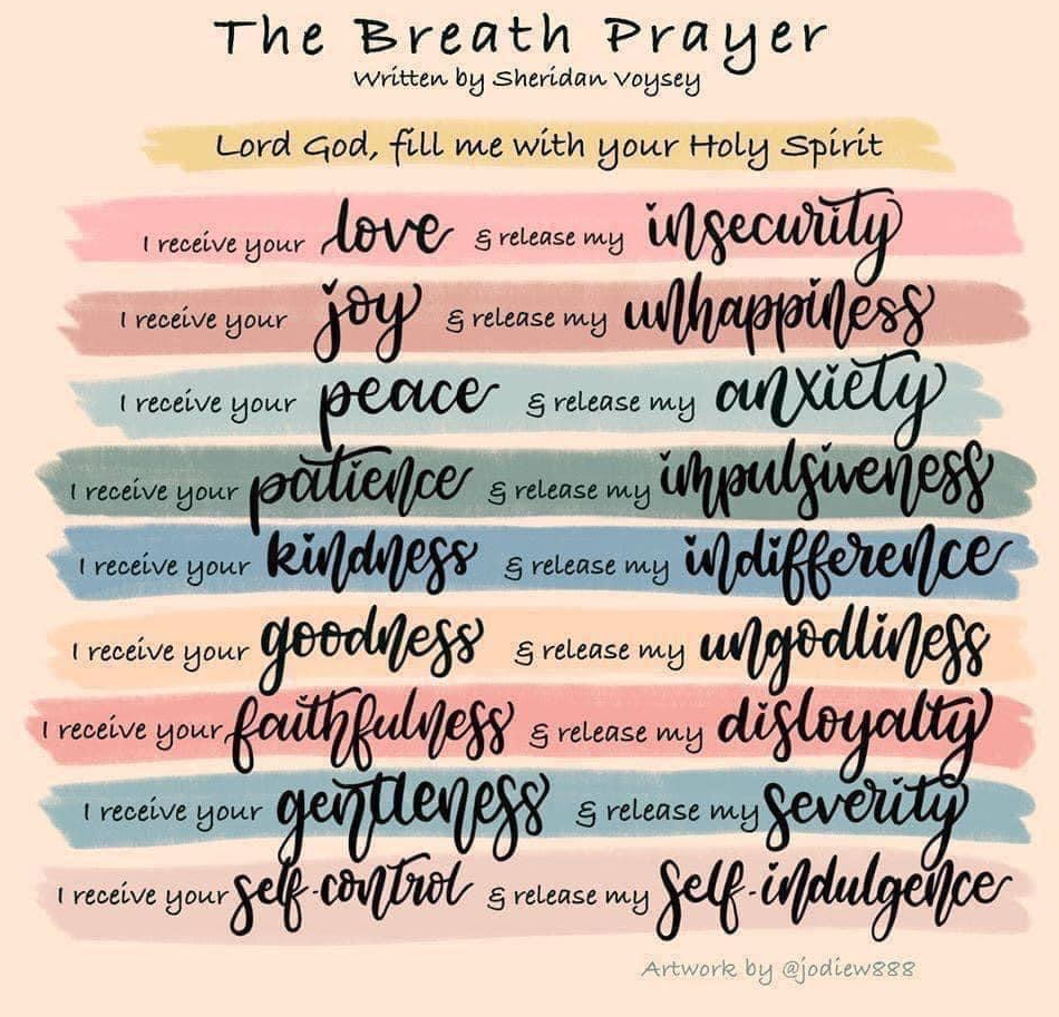 The Breath Prayer written by Sheridan Voysey Lord God, Fill me with your Holy Spirit. I receive your love & release my insecurity. I receive your joy& release my unhappiness. I receive your peace & release my anxiety. I receive your patience & release my impulsiveness. I receive your kindness & release my indifference. I receive your goodness & release my ungodliness. I receive your faithfulness & release my disloyalty. I receive you gentleness & receive my severity. I receive your self-control & release my self-control.*