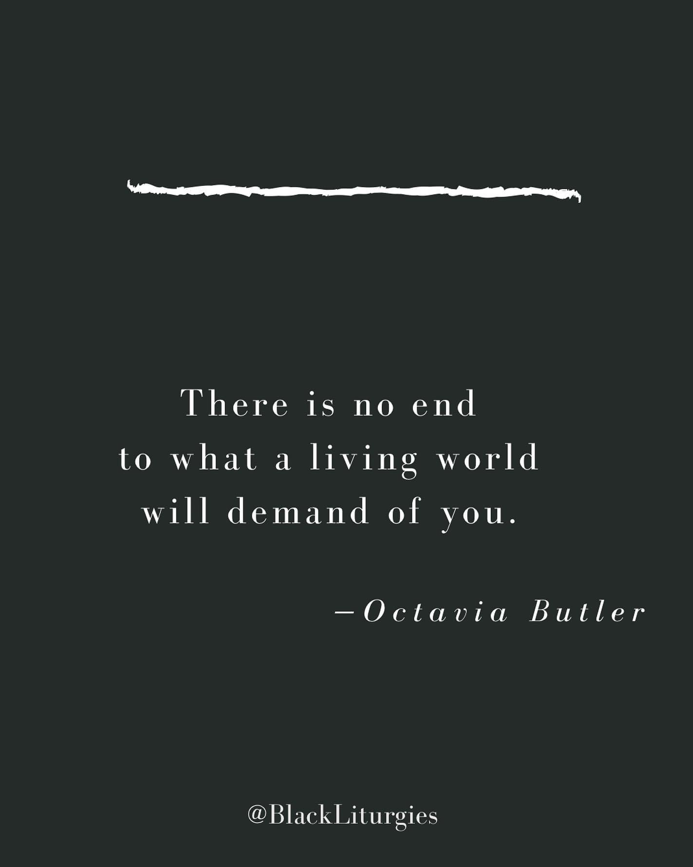There is no end to what a living world will demand of you –Octavia Butler @BlackLiturgies author is Cole Arthur Riley who also wrote “This Here Flesh” Sermon Series (Which you may recall is a sister series to this one)