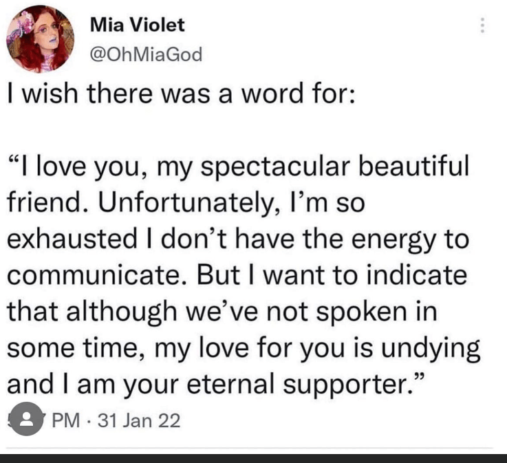 @OhMiaGod I wish there was a word for “I love you, my spectacular beautiful friend. Unfortunately, I’m so exhausted I don’t have the energy to communicate. But I want to indicate that athough we’ve not spoken in some time, my love for you is undying and I am your eternal supporter.”