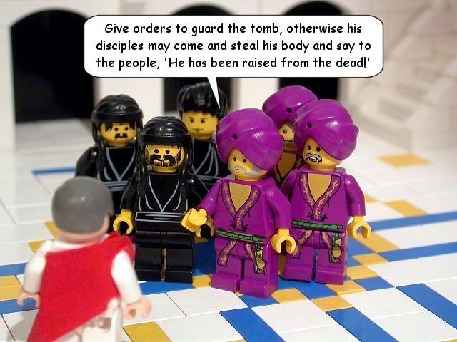 The next day, that is, after the day of Preparation, the chief priests and the Pharisees gathered before Pilate and said, ‘Sir, we remember what that impostor said while he was still alive, “After three days I will rise again.” Therefore command that the tomb be made secure until the third day; otherwise his disciples may go and steal him away, and tell the people, “He has been raised from the dead”, and the last deception would be worse than the first.’ Pilate said to them, ‘You have a guard of soldiers; go, make it as secure as you can.’ So they went with the guard and made the tomb secure by sealing the stone. Matthew 27: 62-66