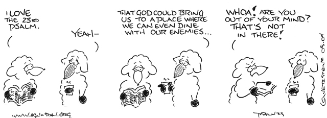 Prayer of Confession: God, I know sometimes that goodness and mercy are chasing me because I’m distracted, or too hurried. I know too that it is hard to feel goodness and mercy when I am overwhelmed or in survival mode. Help me. Help me to see and understanding and feel the goodness and mercy that are already in my life. Teach me ways to cultivate these: with rest, nourishment and a practice of living out of abundance instead of scarcity. Teach me to be a Psalm 23 sheep I pray. (Silent Confession) Amen.