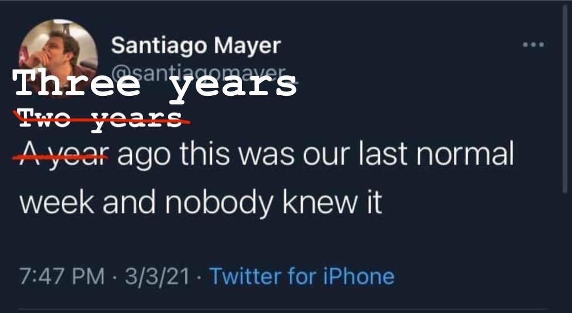 Image is “A year ago crossed out, two years ago crossed out, three years, this was our last normal year and nobody knew it” tweeted by Santiago mayer” dated 3/3/21