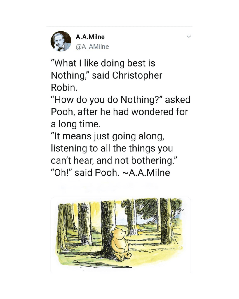 Illustration of Pooh sitting among the Trees @A_AMilne “What I like doing best is Nothing,” said Christopher Robin. “How do you do Nothing?” asked Pooh, after he had wondered for a long tim. “IT means just going along, listening o all the things you can’t hear, and not bothering.” “Poh!” said Pooh. -A.A. Milne.