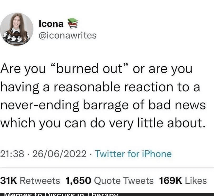 @iconawrites “Are you ‘burned out” or are you having a reasonable reaction to a never-ending barrage of bad news which you can do very little about. (Tricia Hersey recommends Social Media breaks, and taking care of your full self and remaining rooted int community over trying to save the world)